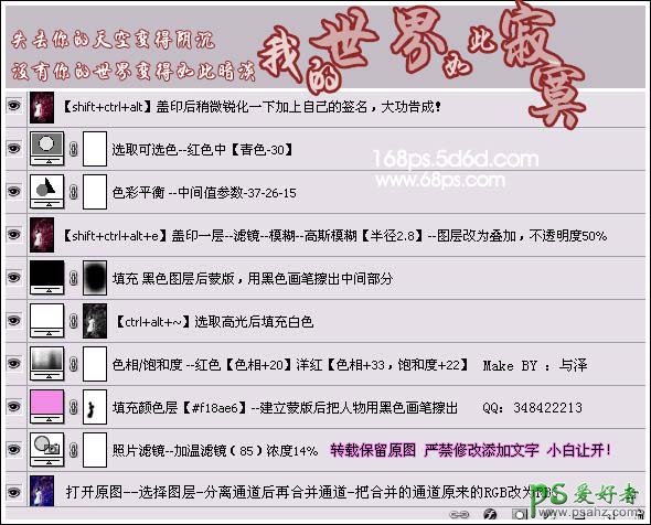打开原图,点通道面板,选择右边的小三角形,选择菜单中的分离通道,这个时候就会调出三张图片,然后再选择三角形里面的菜单选择合并通道,在弹出的菜单选择RGB颜色,确定后再弹出的菜单把通道的顺序改一下,RGB改为RBG。这一步比较复杂。其它步骤请参照下图:
