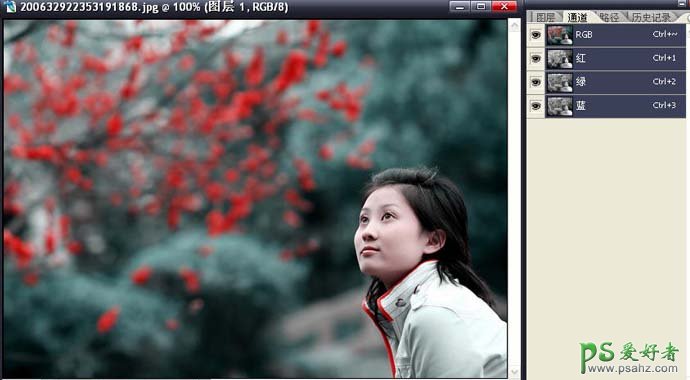 1、打开原图素材,把背景图层复制一层。 2、点通道面板,选择绿色通道,按Ctrl + A全选,按Ctrl + C复制,点蓝色通道,按Ctrl + V粘贴,回到图层面板,效果如下图。