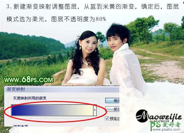 3、新建渐变映射调整图层,颜色设置为蓝色到米黄色,确定后把图层混合模式改为“柔光”,图层不透明度改为:80%。