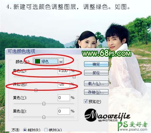 4、新建可选颜色调整图层,对绿色进行调整参数设置如下图。