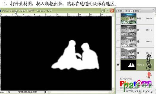 1、打开素材图片,把人物部分勾出来,然后在通道面板,新建一个通道填充白色。