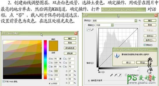 2、创建曲线调整图层,双击白色吸管,选择土黄色,确定操作,用吸管在图片中最亮的地方单击,然后调亮RGB通道,确定操作,在弹出的对话框选择否,载入刚才保存的通道选区,设置前景为灰色,再选区太能充灰色。