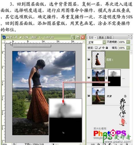 3、回到图层面板,选中背景图层,复制一层,再次进入通道面板,选择明度通道,执行:图像 > 应用图像,模式:正片叠底,其它选项默认,确定操作后再重复操作一次,不透明度为:50%。回到图层面板,添加图层蒙版,用黑色画笔涂去不需要操作的部位。