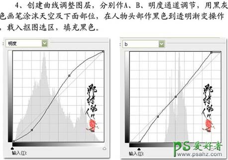 4、创建曲线调整图层,分别做a,b,明度通道调节,用黑灰色画笔涂抹天空及下面部位,在人物头部做黑色到透明渐变操作,载入抠图选区,填充黑色。