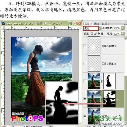 5、选择菜单:图像 > 模式 > RGB颜色,选择合拼,再把背景图层复制一层,图层混合模式改为“柔光”,加上图层蒙版,载入抠图选区填充黑色,再用黑色画笔在过暗的地方涂抹。