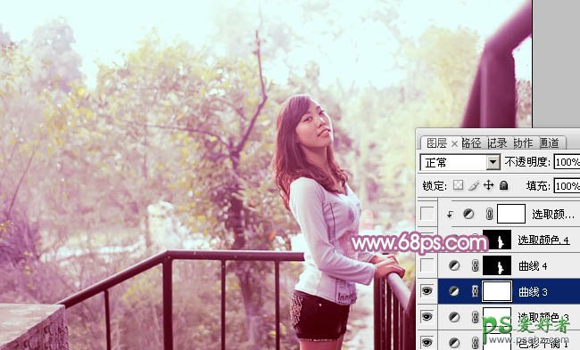 PS给外景漂亮超短裙女生照片调出唯美紫色调