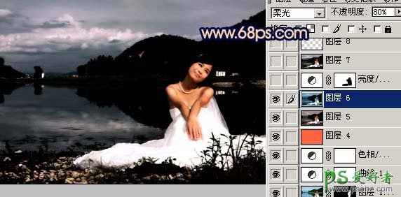 8、新建一个图层,E盖印图层,按Ctrl + Shift + U去色,执行:滤镜 > 模糊 > 高斯模糊,数值为5,确定后再按Ctrl + B调下色彩平衡,把青色调到最大,蓝色适当调大一点,然后把图层混合模式改为“柔光”,图层不透明度改为:80%,图层及效果如图13。