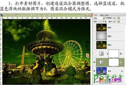 1、打开素材图片,创建通道混合器调整图层,选择蓝色通道,把蓝色滑块的数据调节为0,然后把图层混合模式改为“强光”。