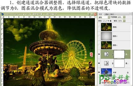 2、再创建通道混合器调整层,选择绿色通道,把绿色滑块的数据调节为0,图层混合模式改为“滤色”,图层不透明度改为:60%。
