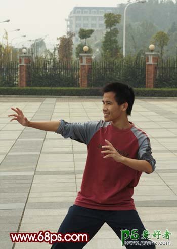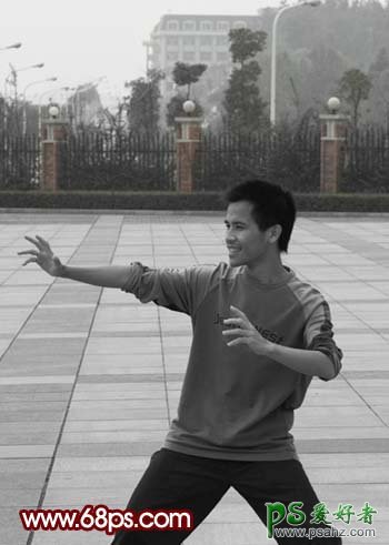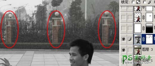 2、新建一个图层,按Ctrl + Alt + Shift + E盖印图层,按Ctrl + Shift + U去色,加上图层蒙版,用黑色画笔稍微把图2所示红圈位置柱子涂一下,画笔透明度稍微低一点,涂出的效果不要太明显如图3。