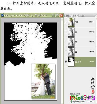 PS婚片调色实例教程,photoshop调出梦幻清新色调情侣婚纱照。 最终效果 原图 1、打开素材图片,进入通道面板,把蓝色通道复制一份,把天空抠出来。 2、载入蓝副本通道选区,回到图层面板,复制选区内容,得到图层1,拖入天空素材图片,调