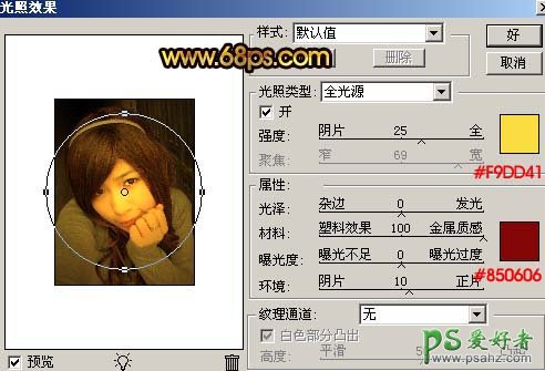 1、打开原图素材,按Ctrl + J把背景图层复制一层,对副本执行:滤镜 > 渲染 > 光照效果,参数设置如图1,效果如图2。