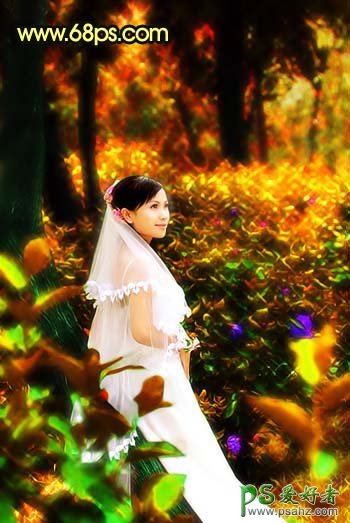 PS婚片美女照片调色教程,photoshop快速调出华丽效果美女婚片,本教程介绍梦幻婚片的制作方法。调色的时候先把背景部分调成暗红色,然后再单独出来人物部分。把两部分色彩调整差不多以后,就用滤镜效果制作一些梦幻星光即可。 最终效果 原图