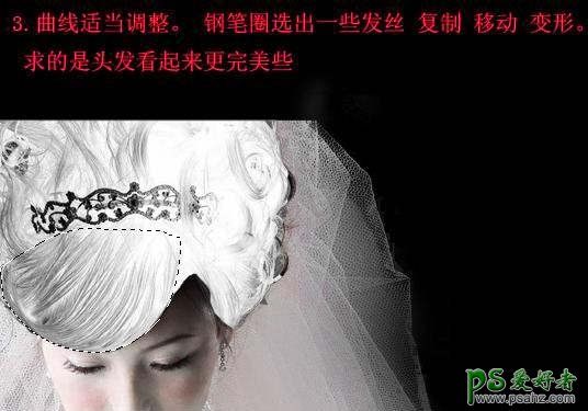 3、适当把头发调整下曲线。然后用钢笔选取一块较好的头发部分,复制移动变形后放到有缺口的头发部分,让头发看起来更完美些。
