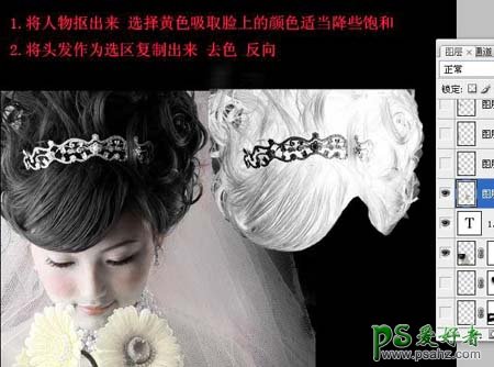 1、将人物抠出来,然后按Ctrl + U调整色相/饱和度,选择黄色吸取脸上的颜色适当降低饱和度。 2、将头发部分抠出来,复制出来,按Ctrl + Shift + U去色。