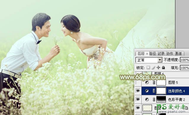 PS婚片调色实例教程,PS婚片调色教程:给外景婚片少女调出油菜花效果,淡绿色是比较常用的颜色,不过柔和的淡绿色是比较难控制的,尤其是图片中白色的比例较多的图片,需要适当降低白色的亮度,同时在淡绿色中增加一些淡黄色或淡青色,这样图片会更加柔和