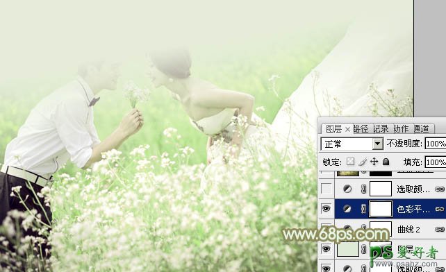 PS婚片调色实例教程,PS婚片调色教程:给外景婚片少女调出油菜花效果,淡绿色是比较常用的颜色,不过柔和的淡绿色是比较难控制的,尤其是图片中白色的比例较多的图片,需要适当降低白色的亮度,同时在淡绿色中增加一些淡黄色或淡青色,这样图片会更加柔和