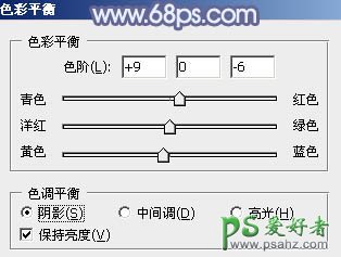 7、创建色彩平衡调整图层,对阴影、中间调、高光进行调整,参数设置如图19 - 21,确定后把蒙版填充黑色,用白色画笔把人物脸部及手臂部分擦出来,效果如图22。这一步把人物肤色部分调红润。