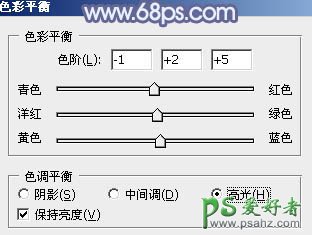 13、创建色彩平衡调整图层,对高光进行调整,参数及效果如下图。这一步给图片的高光部分增加淡蓝色。
