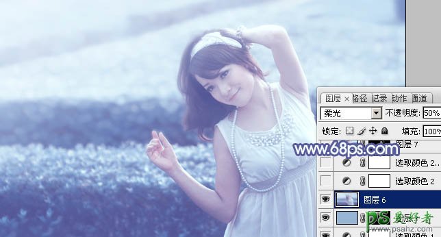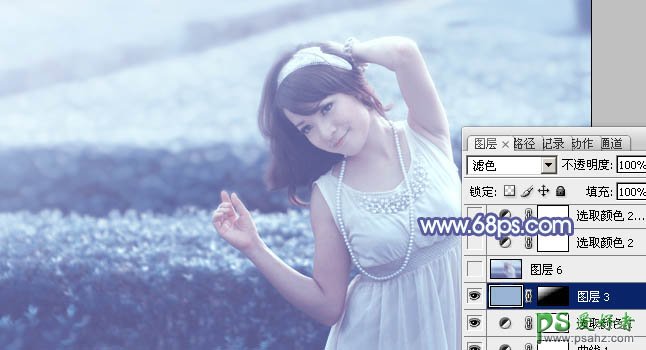 8、新建一个图层,填充蓝色:#97B4D2,混合模式改为“滤色”,按住Alt键添加图层蒙版,用白色画笔把左上角部分擦出来,效果如下图。这一步给图片增加高光。