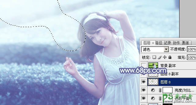 14、新建一个图层,混合模式改为“滤色”,把前景颜色设置为绿色:#849F64,用画笔把下图选区部分涂上前景色,增加图片高光,效果如下图。