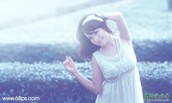 PS美女照片调色实例教程,photoshop调出淡淡的蓝色梦幻美女人像,淡蓝色图片调色也有捷径,可以用通道替换得到青红色图片,然后把青红色转为蓝色就可以得到蓝色图片。后期再把图片颜色调淡,局部增加一些青色等即可。
