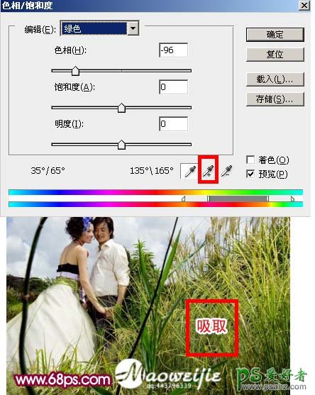 1、打开素材图片,创建色相/饱和度调整图层,选择绿色通道,用下图加号吸管工具,吸取草的颜色,然后调整色相。