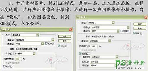 1、打开素材图片,选择菜单:图像 > 模式 > Lab颜色,把背景图层复制一层,进入通道面板,选额明度通道,执行:图像 > 应用图像操作,参数设置如下图,确定后再执行一层应用图像操作,勾选“蒙版”,回到图层面板,转到RGB模式,点不合拼。
