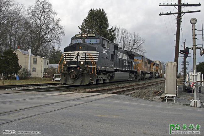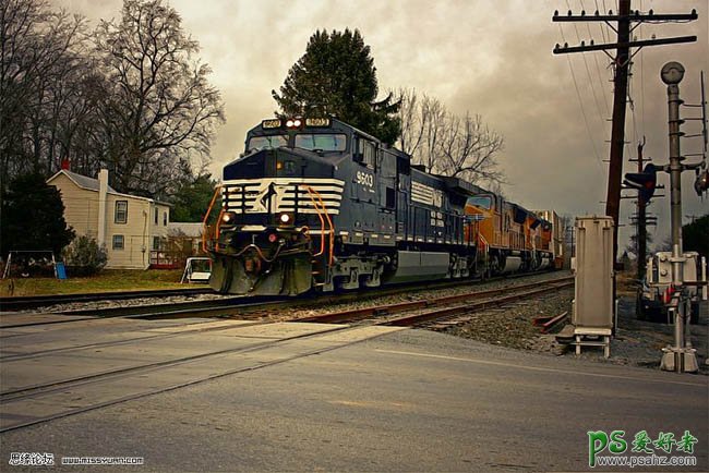 ,PS调出一幅怀旧风格的火车街景照。