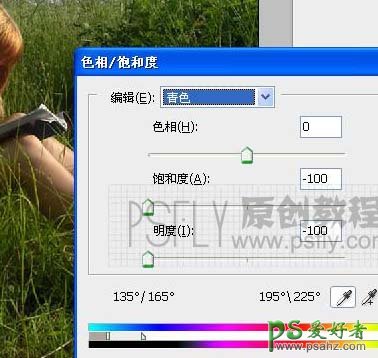 2、创建色相/饱和度调整图层,参数设置如下图,改变天空颜色。