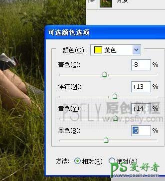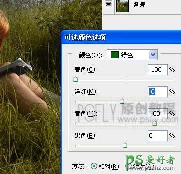 4、创建可选颜色调整图层,参数设置如下图,目的:改变草的颜。
