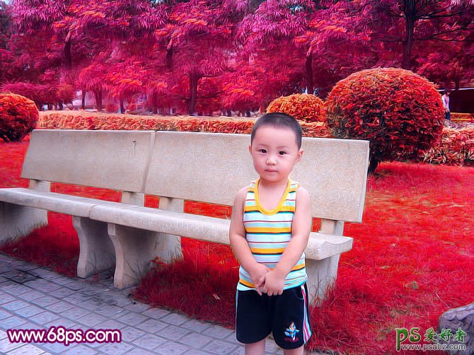 PS照片调色教程实例,儿童艺术照调色教程,PS调出童年可爱儿童照片温馨的红紫色。本教程色调比较鲜艳,整体以红色为主。调色的时候适当把背景及地面部分分开来调。如果背景有碍眼的物体可以用图章工具来修复。