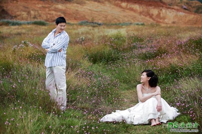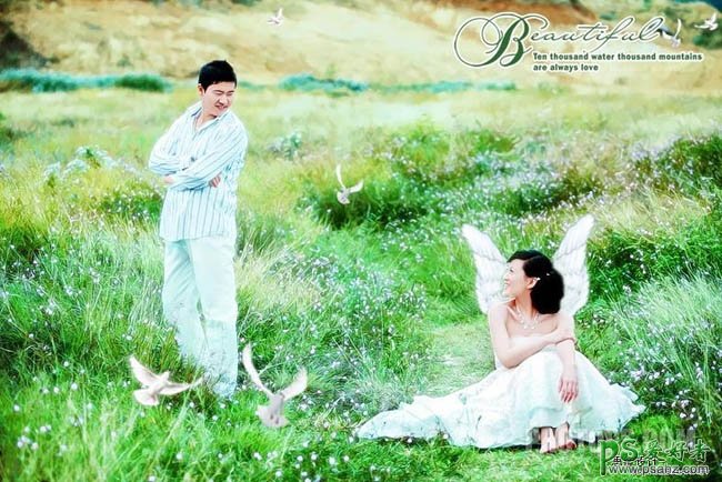今天我们来教大家学习一篇PS婚片后期调色实例教程,PS给草地上的温馨情侣婚纱照调出个性绿色效果,本教程介绍梦幻风格婚片调色方法。原图素材不完全是绿色,调色的时候先用调色工具把一些不是绿色部分调绿,再适当加强绿色的鲜明度,最后装饰一些素材即可。