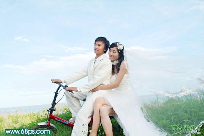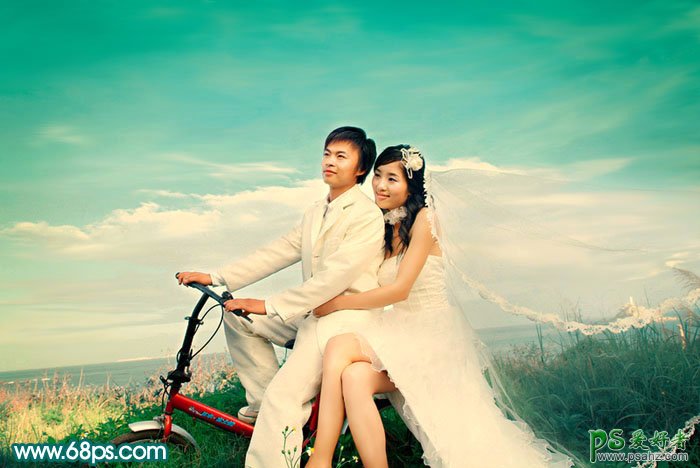 PS婚片调色教程实例,PS给自行车上的浪漫情侣婚纱照调出温馨的暖色调,原图素材拍摄的非常完美,总体感觉清新自然。调色的时候为了不影响整体,只是稍微加了点颜色,背景部分稍微加深了一点。其它部分可以按照自己的喜好去调整。