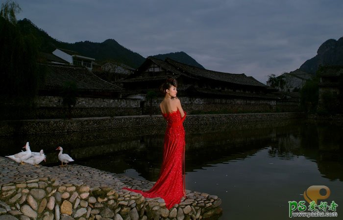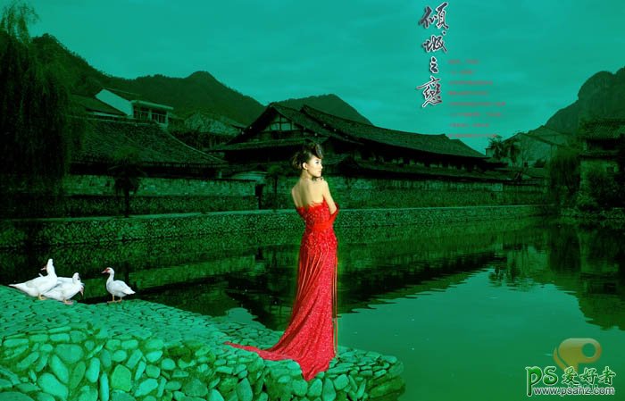 今天我们来学习一篇时尚美女照片调色教程,PS美女艺术照调色教程,利用photoshop调出个性的墨绿色红裙美女艺术照,本教程的效果有种中国古典韵味。墨绿色的背景衬托出鲜红的人物。犹如开在绿叶中的鲜花。再加上背景部分为古典建筑,更加突出古典韵味,效果耐人寻味。