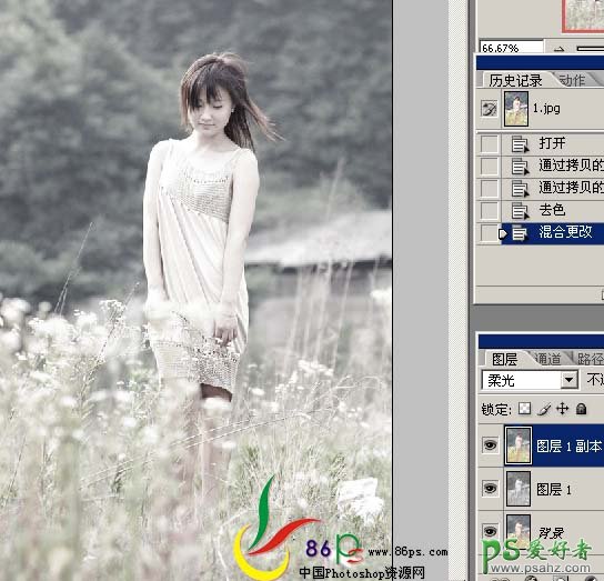 2、选择图层1,执行Ctrl+Shift+U去色,再将图层1副本的图层模式设为:柔光。