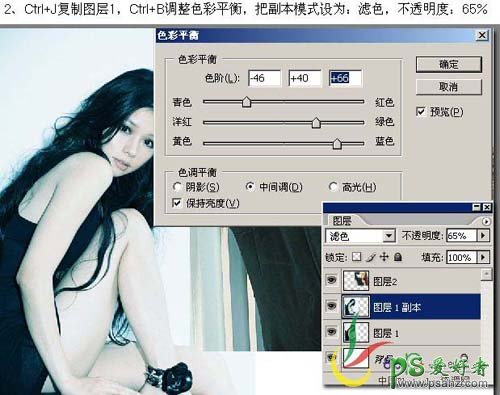 2、按Ctrl + J 复制图层1,按Ctrl + B 调整色彩平衡,把副本模式设为:滤色。,不透明度改为:65%