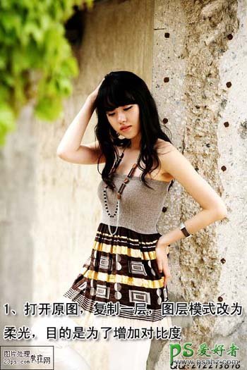 1、打开原图,复制一层,图层模式改为柔光,目的是为了增加对比度。