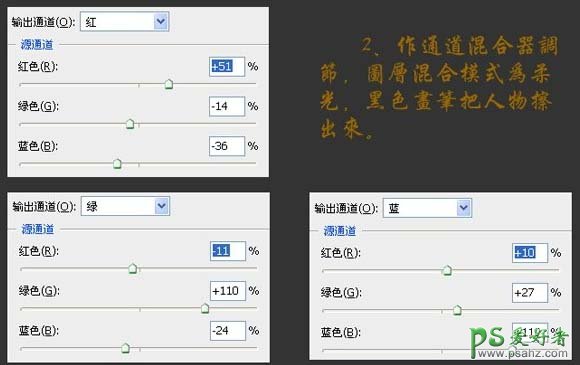 混合器调整图层,参数设置如下图,确定后把图层混合模式改为“柔光”,用黑色画笔把人物部分擦出来。
