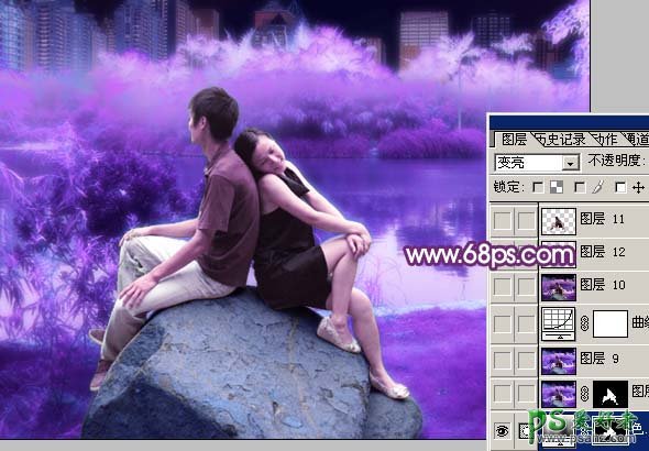 今天我们一起来学习一篇漂亮的PS情侣照片调色实例教程,photoshop调出梦幻绚紫风格情侣艺术照,本教程色调以紫色为主。原图素材较为明亮,不过经过反相处理后,效果就非常接近夜景照片。只是图片的局部有反白效果。需要慢慢去修复。 最终效果 原