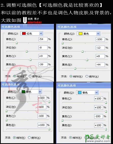 2、创建可选颜色调整图层,对人物及背景大致调整,参数设置如下图。