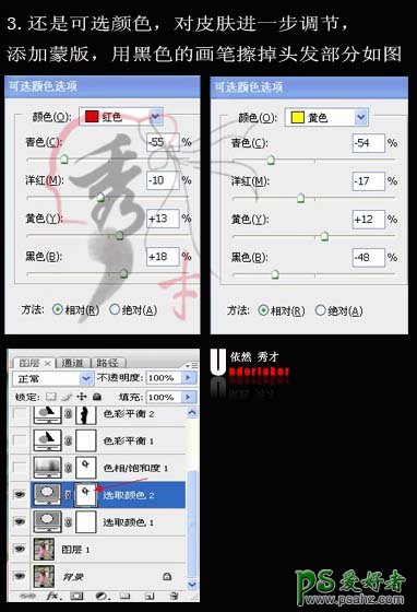 3、还是可选颜色,对人物皮肤进行细调,确定后用黑色画笔擦掉头发。