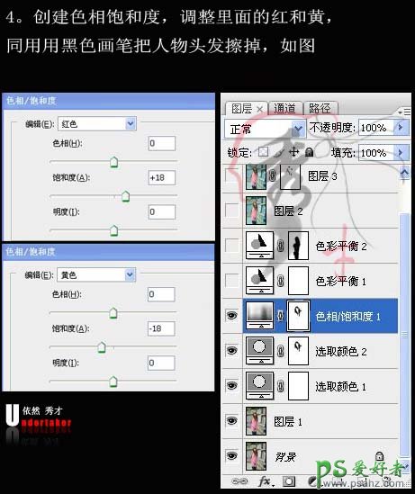 4、创建色相饱和度调整图层,确定后,同样用黑色画笔擦掉头发。