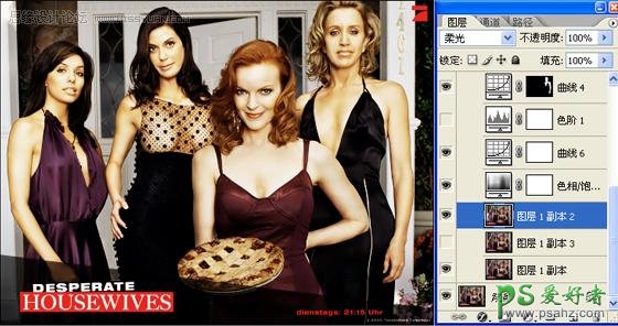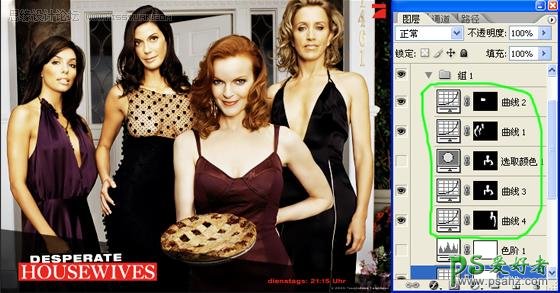 5、由于四个人的光线不同,所以对人物身上的亮度要分开处理,先说左边的两个人,这两个人的光线比较暗,抠出来之后调整曲线,使她们和另外两个人的亮度容和起来,但是要注意的是,第2个女人的胸部要分开调曲线,要喑一点,不能太亮,再用相同的方法去处理右边的两个女人,这里的曲线调整参数我就不细说了,大家看着下手。