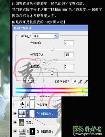 6、执行:图层 > 新建调整图层 > 色相饱和度,因为我发现背景有点过亮,所以我们把绿色降下来,参数设置如下图。