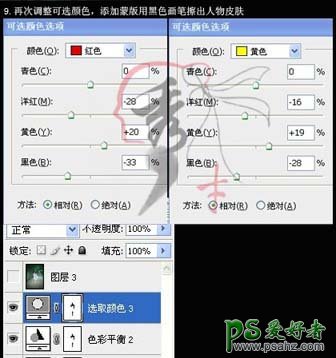 9、再次执行:图层 > 新建调整图层 > 可选颜色,也就是可选3,参数设置如下图,确定后黑色画笔擦出人物皮肤部分。