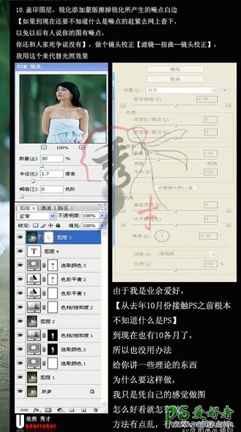 10、新建一个图层,盖印图层,执行锐化,再做个镜头校正,我用镜头校正来代替光照效果。