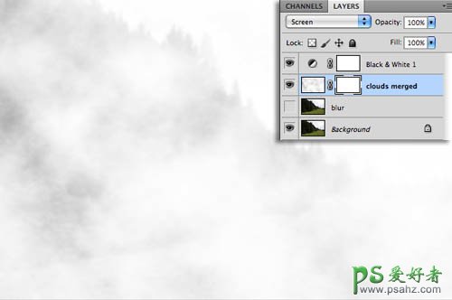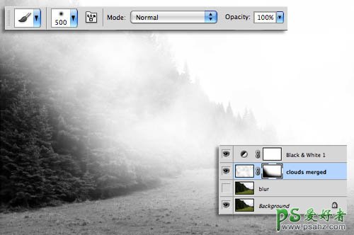 6、现在,我们将工作上细化雾气中的照片的前景。选择图层蒙版缩览图,用流量及透明度较大的黑色画笔把前景部分涂出来。