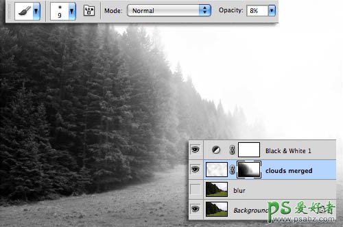 今天我们来学习一篇漂亮的风景照调色实例,PS风景照调色教程实例,PS给树林风景照调出黑白迷雾效果,雾化效果制作虽然不难,不过要做得逼真还得花费一定的时间。最好能够结合生活中的迷雾天气,多观察一下,可以发现在雾中的景色,由清晰变模糊。然后应用