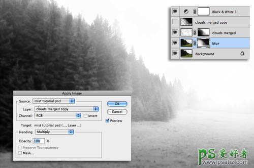 11、选择图层蒙版,去图像>应用图像,并选择倒雾层,你放在前,作为源层。